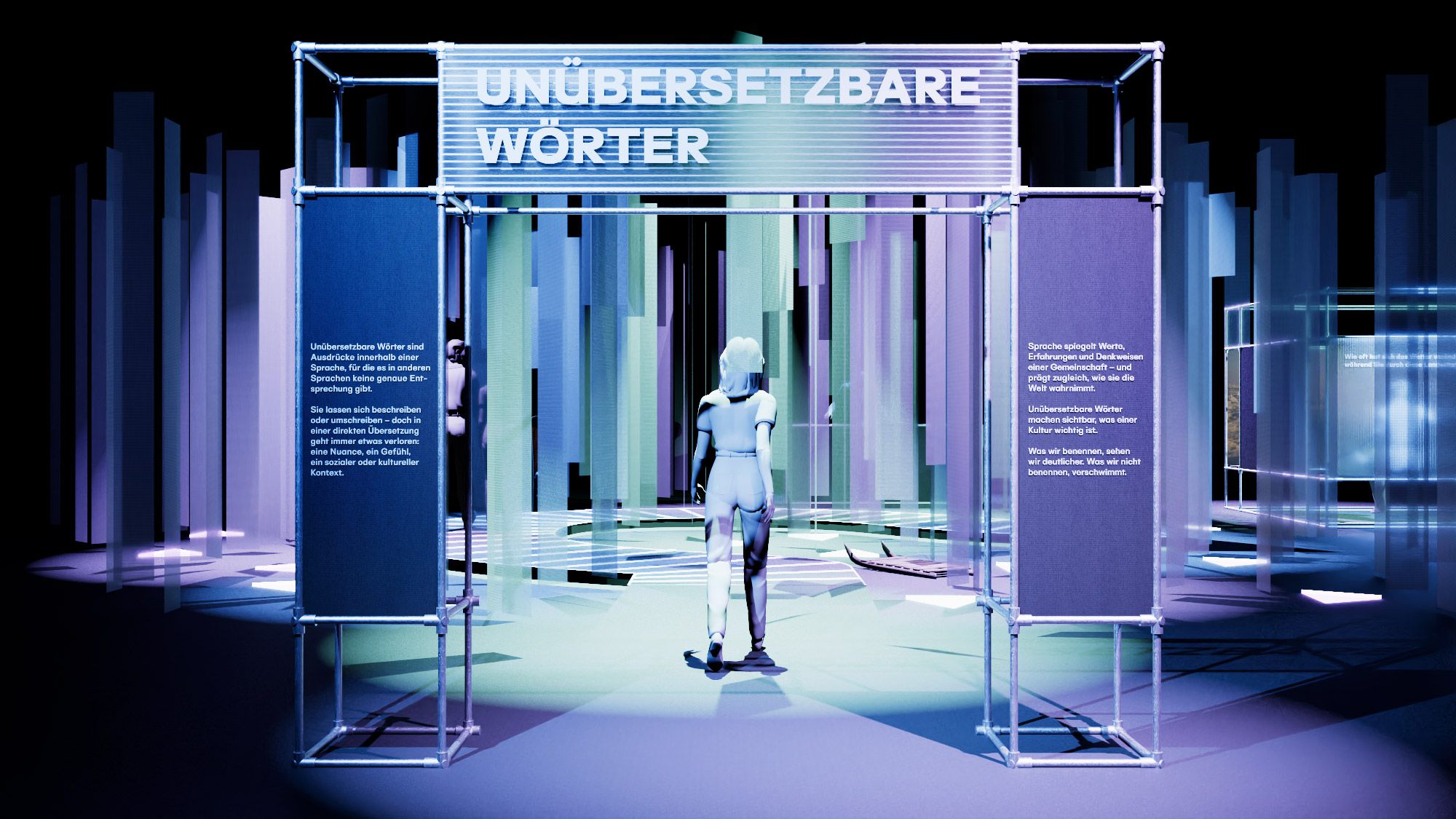 ein dreiteiliges ausstellungskonzept, das unübersetzbare wörter über raum, interaktion und szenografie erfahrbar macht: vom abstrakten einstieg über ein sprachlabor bis zu einem erzählerischen hauptteil.
